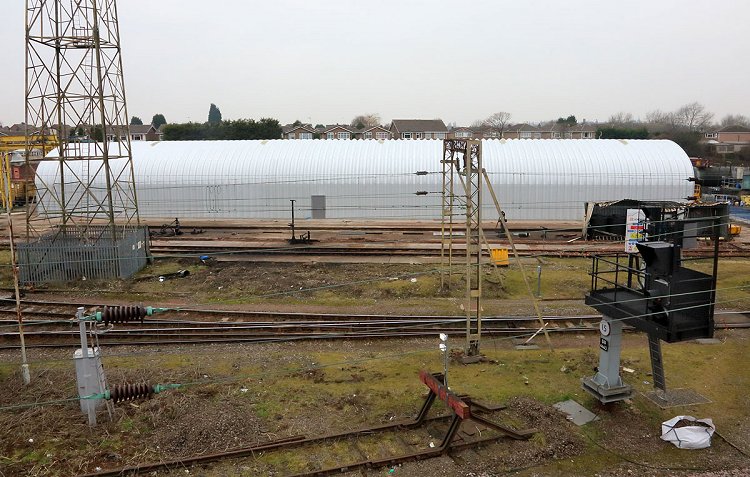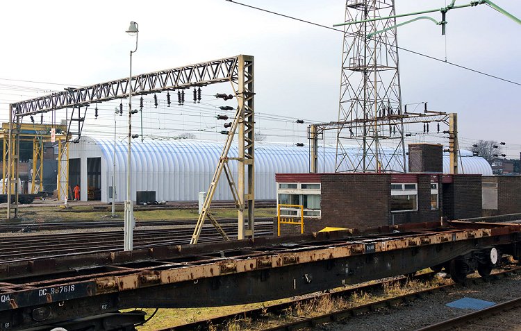 The new maintenance shed at Bescot, as seen from the station footbridge. Photo Nick Broome. 12th February 2015. |