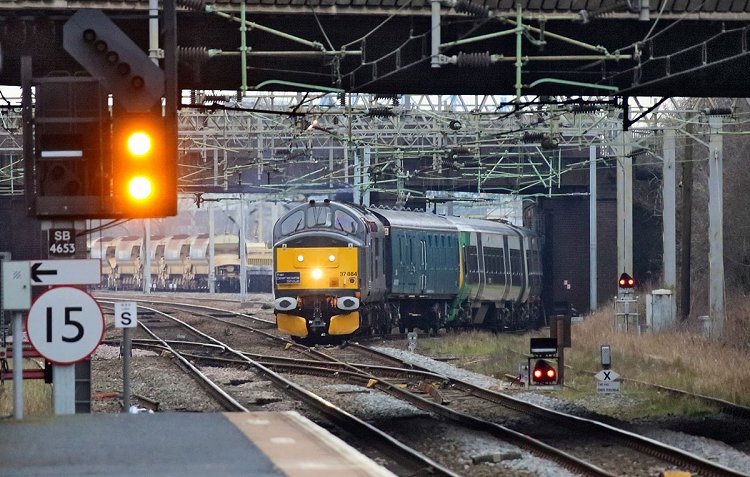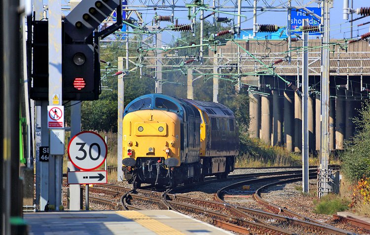 A preserved locomotive built by English Electric leaves Bescot southbound. Seen from the platform at Tame Bridge station. Photo Nick Broome. 10th March 2016. |