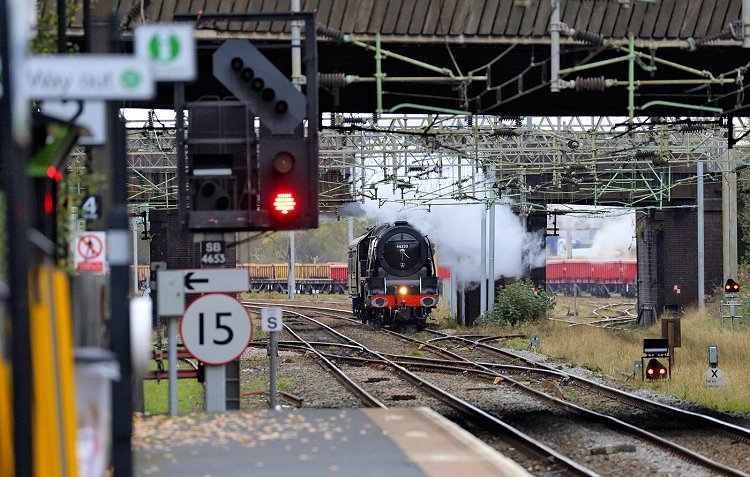 Preserved Princess Coronation class steam locomotive LMS 6233 "Duchess of Sutherland" leaves Bescot southbound. Seen from the platform at Tame Bridge station. Photo Nick Broome. 16th Octobere 2016. |