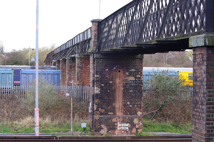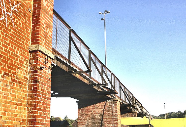 Footbridge over Tonbridge West Yard viewed looking to the south-east from the Clare Avenue end. The approach steps had been rebuilt by the time of this photo, but the bridge itself is as it was when the older sister of the Rail Album webmaster used to cross it on her way to and from school back in the 1940s, getting her clothes dirty by positioning herself so that she would be smothered by the exhaust of a passing steam loco. Photo 7th June 2011. |
