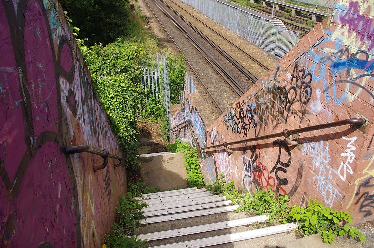 View down the footsteps at the Douglas Road end. Photo 11th July 2012. |